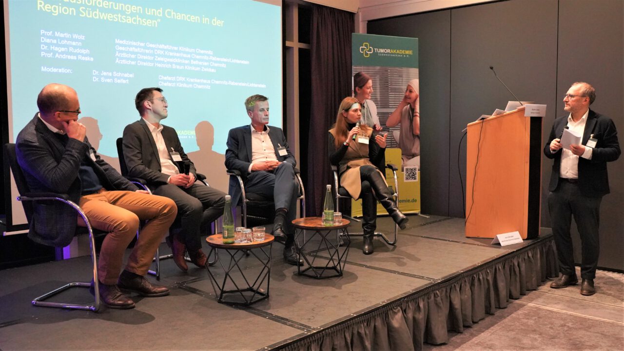 In einer anschließenden Podiumsdiskussion der Geschäftsführungen und Ärztlichen Direktoren aller Chemnitzer Kliniken und des Zwickauer Klinikums waren sich die Beteiligten einig in ihrem Wunsch und Willen, neue Wege zu gehen und innovative Konzepte für die Region zu entwickeln. Nur gemeinsam wird es in Zukunft möglich sein, die onkologische Versorgung in der Region auf einem Spitzenniveau und in der Fläche zu sichern und weiterzuentwickeln, bekräftigten Prof. Reske (Ärztlicher Direktor HBK Zwickau) und Prof. Wolz (Medizinischer Geschäftsführer Klinikum Chemnitz). Die beiden onkologischen Zentren der Region spielen dabei ebenso eine wesentliche Rolle, wie spezialisierte Leistungserbringer in Praxen und kleineren Kliniken. Neue Konzepte der intersektoralen Versorgung könnten dabei für kleinere Krankenhäuser sogar zukunftsweisend sein, unterstrich Frau Lohmann (Geschäftsführerin DRK Kliniken Chemnitz).